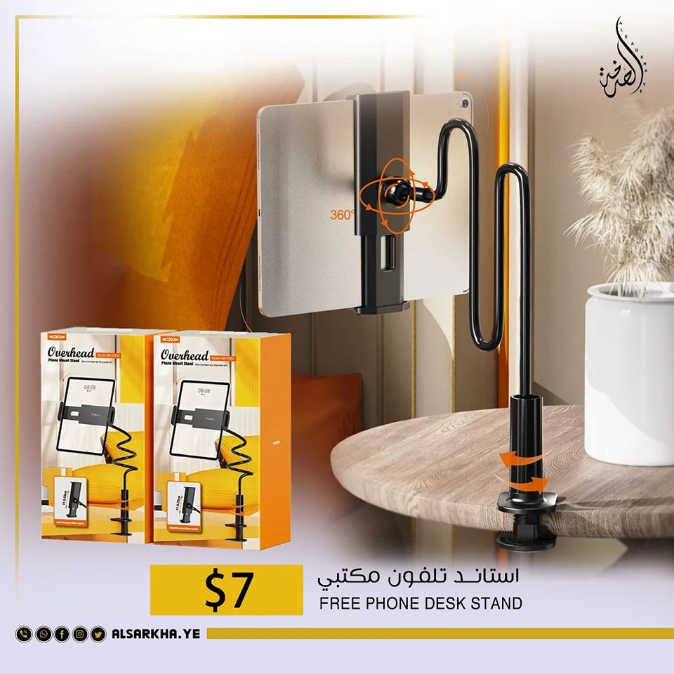 يتميز حامل الهاتف المكتبي في الصورة بتصميم قابل للتعديل، مما يسمح لك بتغيير زاوية الهاتف أو الجهاز اللوحي بسهولة. كما أنه يتميز بقاعدة ثابتة، مما يضمن ثبات الهاتف أو الجهاز اللوحي أثناء الاستخدام.